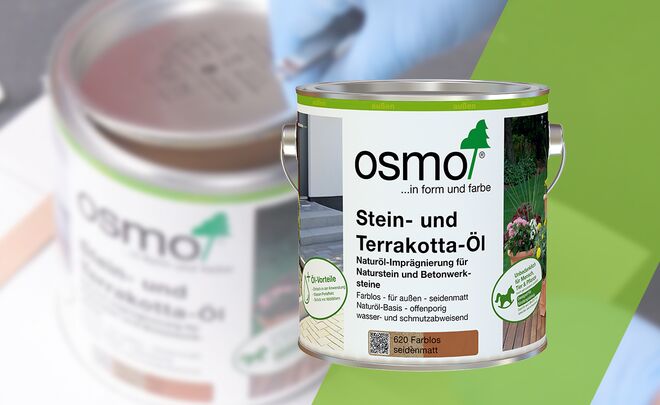 Die Oberfläche muss saugfähig, sauber, trocken und frostfrei sein. Osmo Stein- und Terrakotta-Öl ist anwendungsfertig, nicht verdünnen. Gründlich umrühren.
