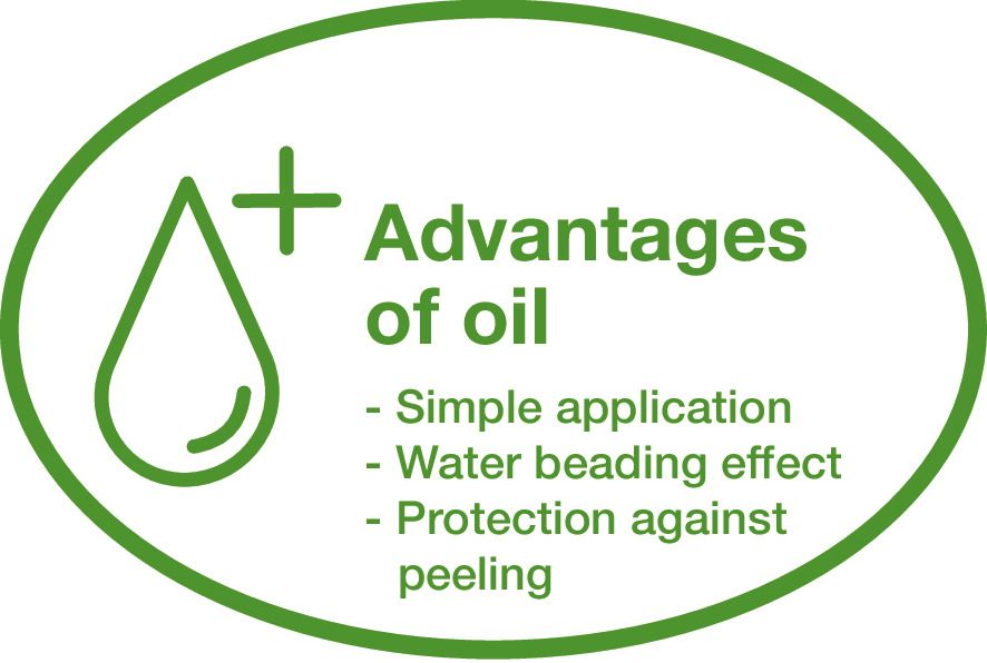 Oil advantages – Simple application, Water beading effect, No flaking or peelingFilm protection – Coating is protected against mould, algae and fungal attack