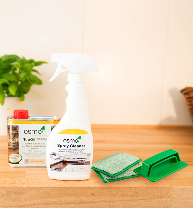 To clean TopOil surfaces, Osmo Spray Cleaner, or alternatively water, is recommended. Washing-up liquids or all-purpose cleaners should not be used as they dissolve oils and fats, thus also waxes and oils found in the surface protection.