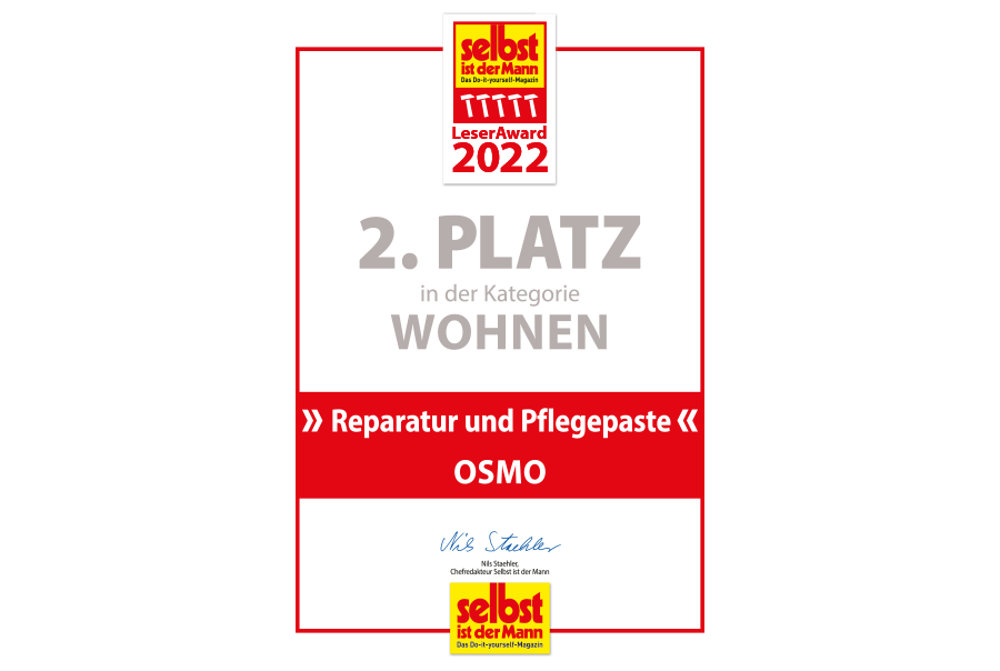 In the vote count for 2022, Osmo landed in second place in the category "Living" with its Hartwachs-Öl Reparatur-und Pflegepaste, thus securing the silver medal on the winners' podium.
