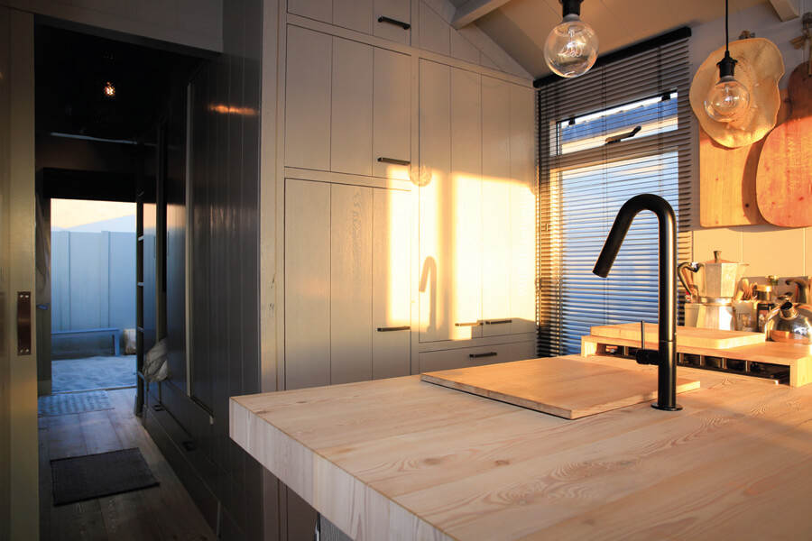 Also inside, soothing natural colours and elements dominate the interior. With such limited space, only what is truly necessary can be included: a bed, a table, chair, built-in cabinets and a small kitchenette. To protect against mould and moisture, the solid wood Larch flooring as well as kitchen worktops and tabletops were treated with one coat each of white and a transparent Osmo Hartwachs-Öl. A soft grey from the Osmo Landhausfarbe range is used on all other surfaces – this not only relaxes the eyes, but also the mind