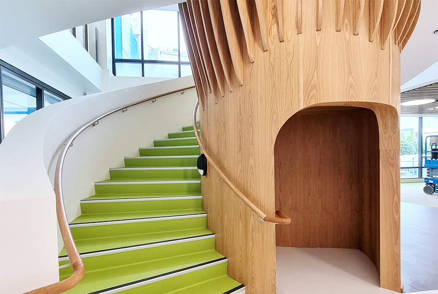 About 3 years ago, Simon Raikes of Craftbuilt was approached by Studio Design and Architecture to help them turn plans for a 7.3 metre high oak tree staircase into a reality. The staircase was to be a central feature at the new, state of the art, Wellington Children’s Hospital. The design was to provide a sense of wonder and distraction from the stark reality of a hospital visit.